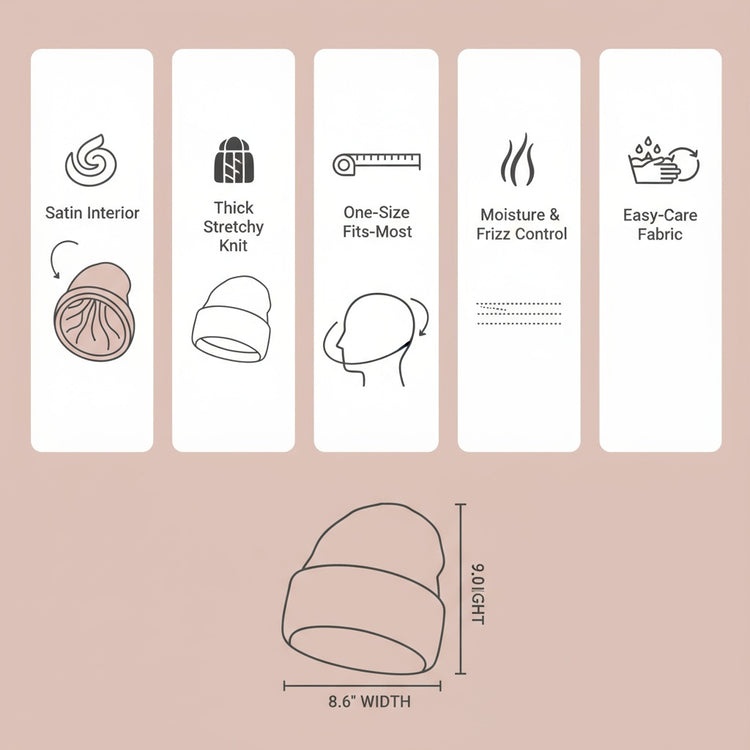 Our beanie features a silky satin lining that reduces friction and static, paired with a thick knit exterior to keep you warm. One-size-fits-most stretch ensures a snug, comfortable fit every time.